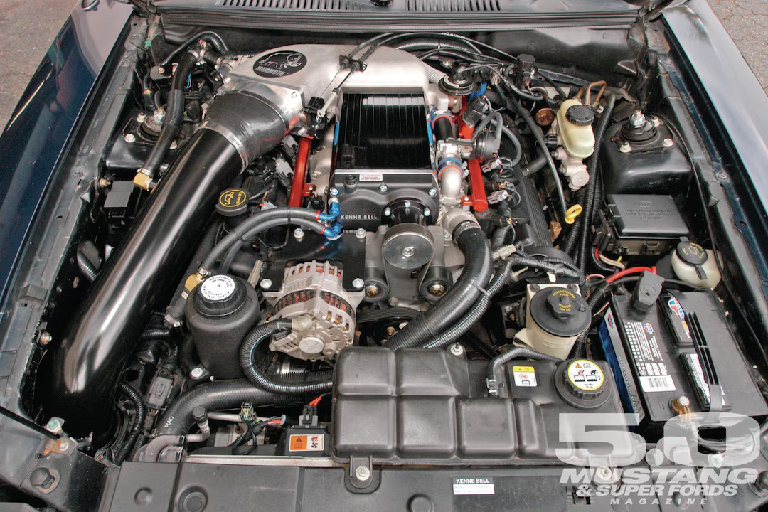 Since it’s debut in 1998, the Mustang 2V Supercharger Kit 9-10 psi kit is still the #1 choice of ’96 -’04 2V owners with stock or mildly modified engines. It can easily max out the stock rods, pistons and block, increasing RWHP from 245 stock to 449 on pump gas with only the supercharger kit. 525 is considered the safe limit. Higher HP levels require forged internals and a stronger block.