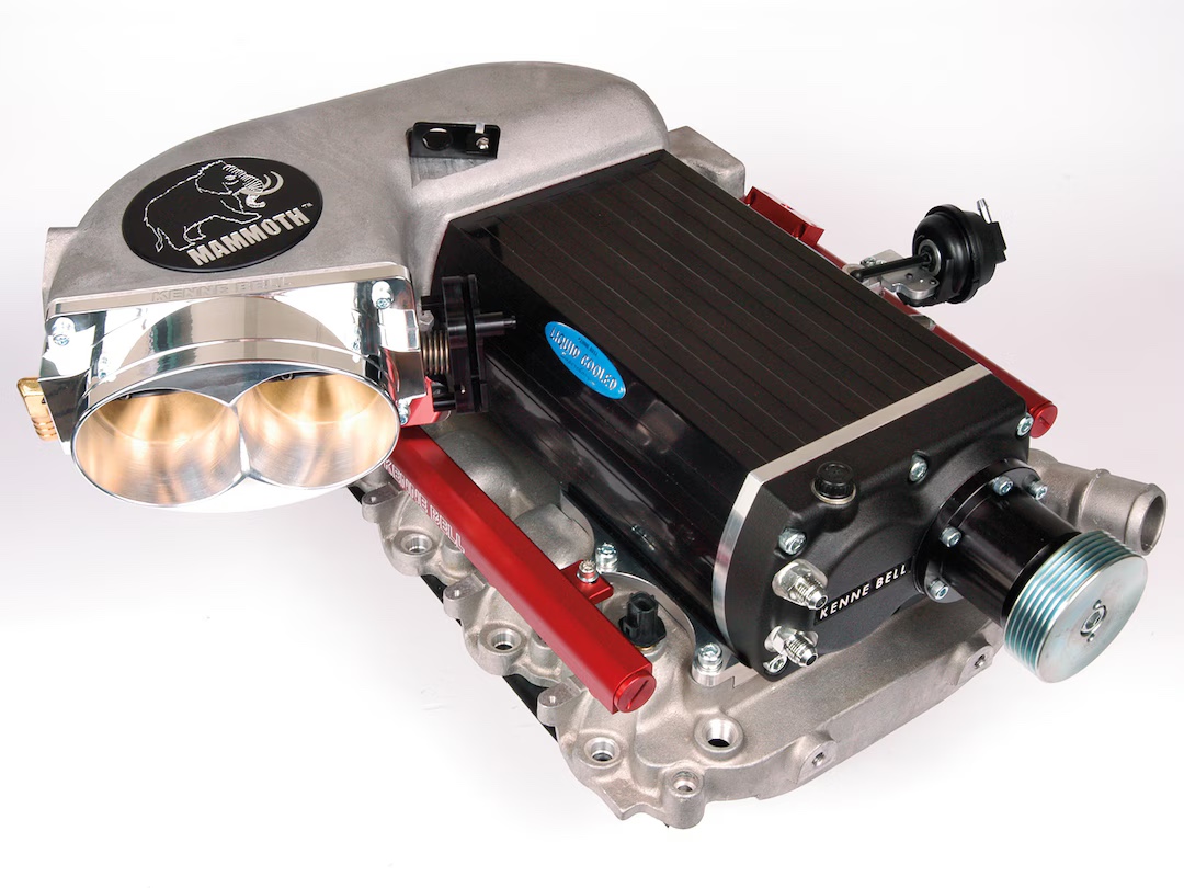 Mustang 2V 1999-2004 Mammoth Tuner Kit has all the basic features of the 2.1, but was engineered to support higher HP and boost (15-28 psi). The 2V 4.6 has great HP potential, especially with heads and cams, but must be supported with equally efficient inlet system. The Mammoth® is 1650 cfm vs. 658 cfm Big Tube/75mm Kit. It utilizes the same lengendary minimum restriction (1400HP rated) Mammoth® Inlet System and Manifold (check out the size difference) concept used on Kenne Bell big HP kits for the 5.4/5.8 Shelby GT 500, 4.6 Cobra 3V, 5.0 Mustang, 6.2-7.0 Camaro and 5.7-7.0 Dodge Hemi. The industry’s largest throttle body (Dual 75 or 168mm) is fed by a huge 4.5″ ram air pipe, meter and filter. Without a Mammoth® high cfm inlet, your high HP engine can easily lose 60HP. The supercharger is starved for air and will run hotter, lose boost/HP and consume more engine HP to drive it.